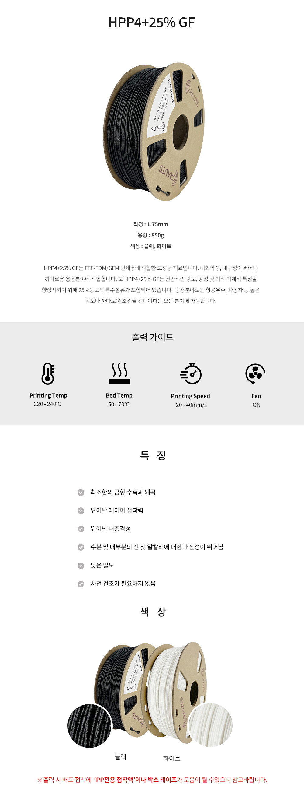 HPP4+25% GF는 특수섬유 25% 강화된 고성능 재료입니다. 금형 수축이 최소화되어 왜곡이 거의 없으며 우수한 접착력과 높은 충격강도를 자랑합니다. 응용분야로는 항공우주, 자동차 등 높은 온도나 까다로운 조건을 건뎌야하는 모든 분야에 가능합니다.