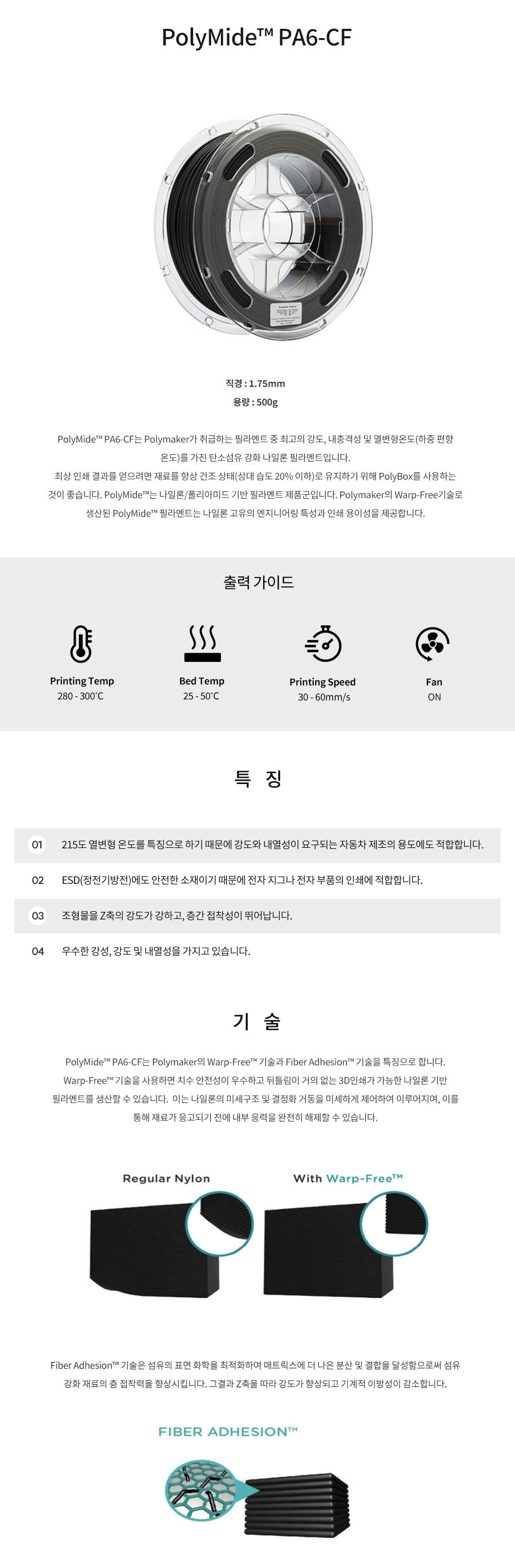 PolyMide™ PA6-CF는 Polymaker가 취급하는 필라멘트 중 최고의 강도, 내충격성 및 열변형온도(하중 편향 온도)를 가진 탄소섬유 강화 나일론 필라멘트입니다.