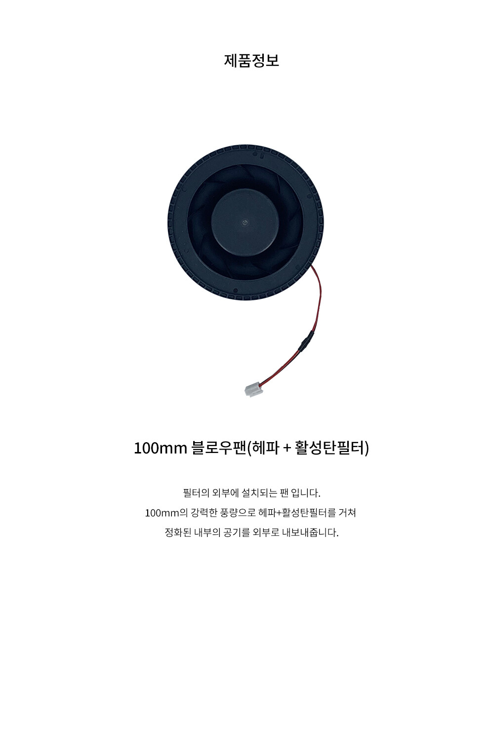 100mm의 강력한 풍량으로 헤파+활성탄필터를 거쳐 정화된 내부의 공기를 외부로 내보내 줍니다.