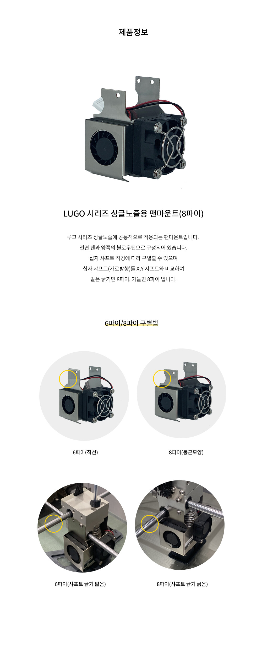 루고 시리즈 싱글노즐에 공통적으로 적용되는 팬마운트 입니다. 전면 팬과 양쪽의 블로우팬으로 구성되어 있습니다.