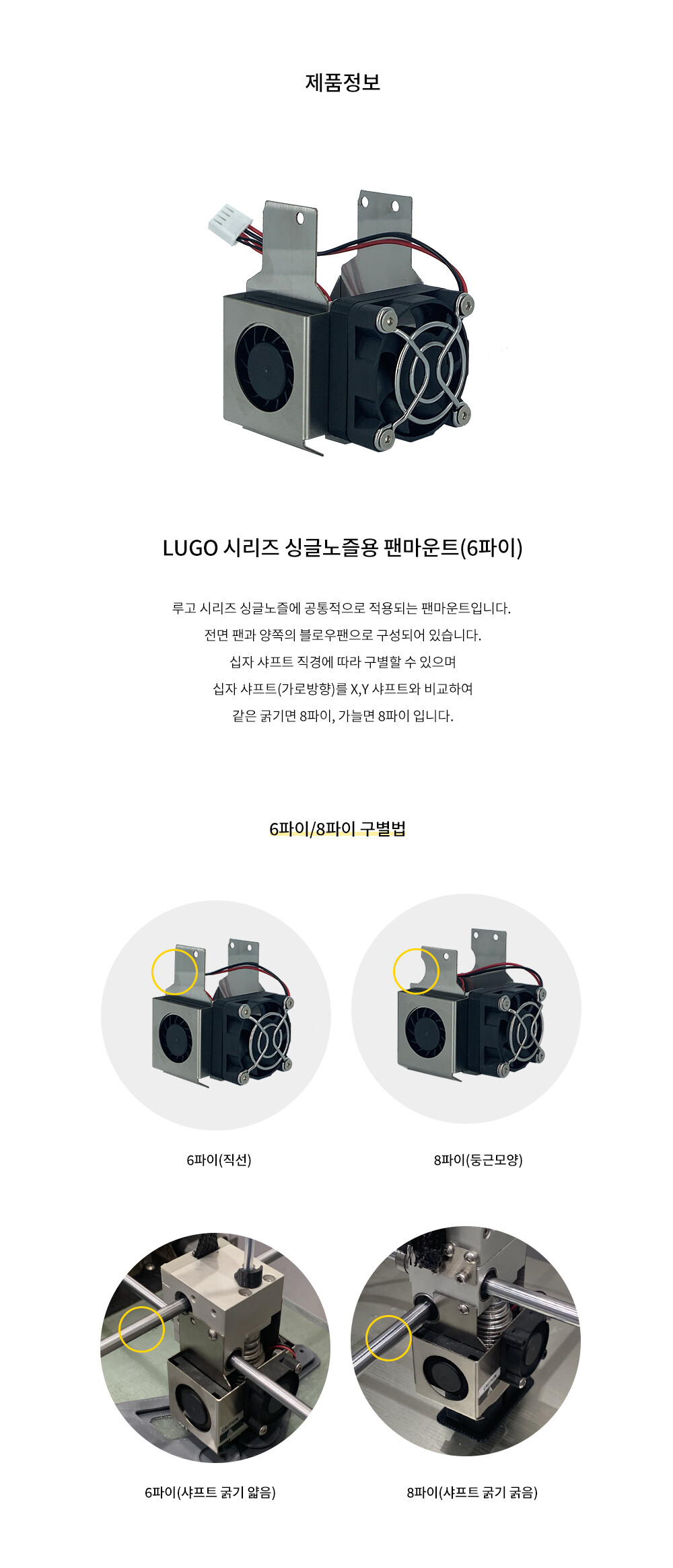 루고 시리즈 싱글노즐에 공통적으로 적용되는 팬마운트 입니다. 전면 팬과 양쪽의 블로우팬으로 구성되어 있습니다.