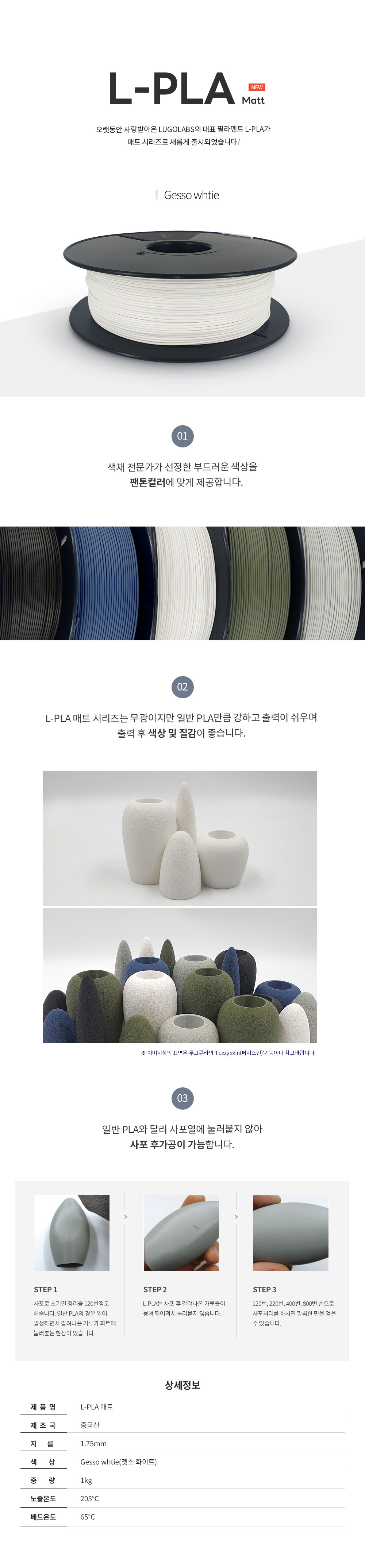 L-PLA 매트 시리즈는 무광이지만 일반 PLA만큼 강하고 출력이 쉬우며 출력 후 색상 및 질감이 좋습니다.