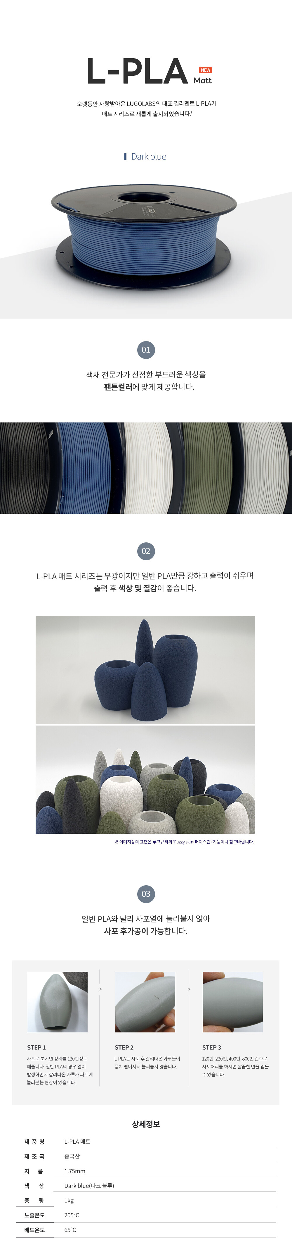 L-PLA 매트 시리즈는 무광이지만 일반 PLA만큼 강하고 출력이 쉬우며 출력 후 색상 및 질감이 좋습니다.