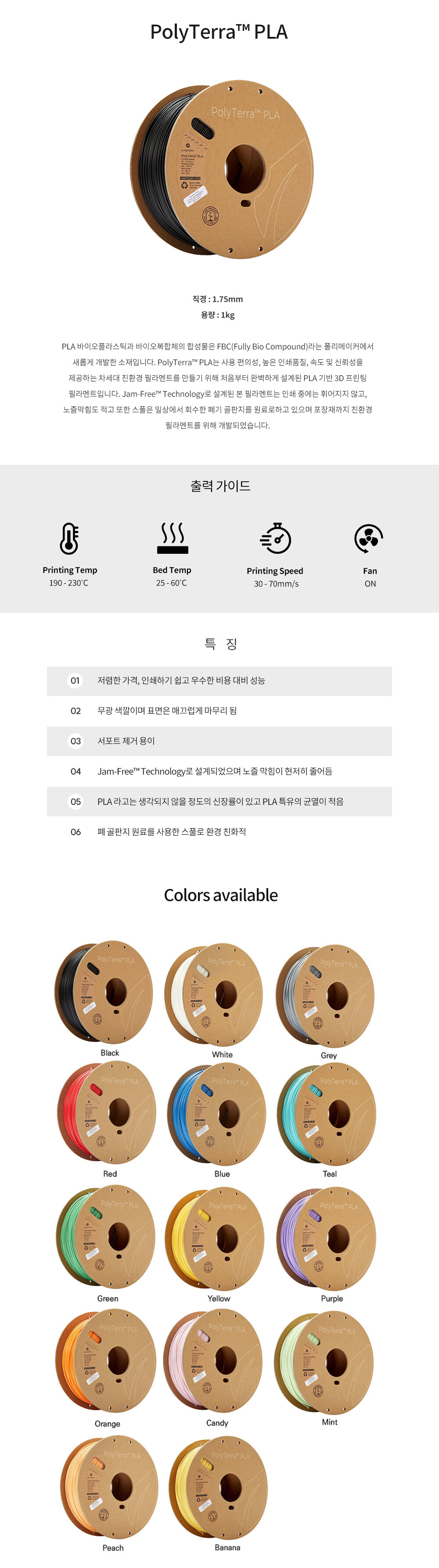 PLA 바이오플라스틱과 바이오복합체의 합성물은 FBC(Fully Bio Compound)라는 폴리메이커에서 새롭게 개발한 소재입니다. PolyTerra™ PLA는 사용 편의성, 높은 인쇄품질, 속도 및 신뢰성을 제공하는 차세대 친환경 필라멘트를 만들기 위해 처음부터 완벽하게 설계된 PLA 기반 3D 프린팅 필라멘트입니다. Jam-Free™ Technology로 설계된 본 필라멘트는 인쇄 중에는 휘어지지 않고, 노즐막힘도 적고 또한 스풀은 일상에서 회수한 폐기 골판지를 원료로하고 있으며 포장재까지 친환경 필라멘트를 위해 개발되었습니다.