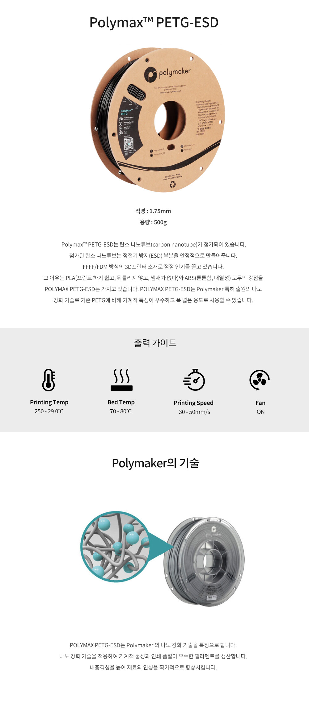 Polymax™ PETG-ESD는 탄소 나노튜브(carbon nanotube)가 첨가되어 있습니다. 첨가된 탄소 나노튜브는 정전기 방지(ESD) 부분을 안정적으로 만들어줍니다. FFF/FDM 방식의 3D프린터 소재로 점점 인기를 끌고 있습니다. 그 이유는 PLA(프린트 하기 쉽고, 뒤틀리지 않고, 냄새가 없다)와 ABS(튼튼함,내열성) 모두의 강점을 POLYMAX PETG-ESD는 가지고 있습니다. POLYMAX PETG-ESD는 Polymaker 특허 출원의 나노 강화 기술로 기존 PETG에 비해 기계적 특성이 우수하고 폭넓은 용도로 사용할 수 있습니다.